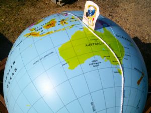 地球儀の「周回クン」。1日平均90キロペースで南へ向かっています。