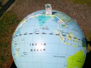 地球儀の「一周チャン」。1日平均70キロペースで東へ向かっています。