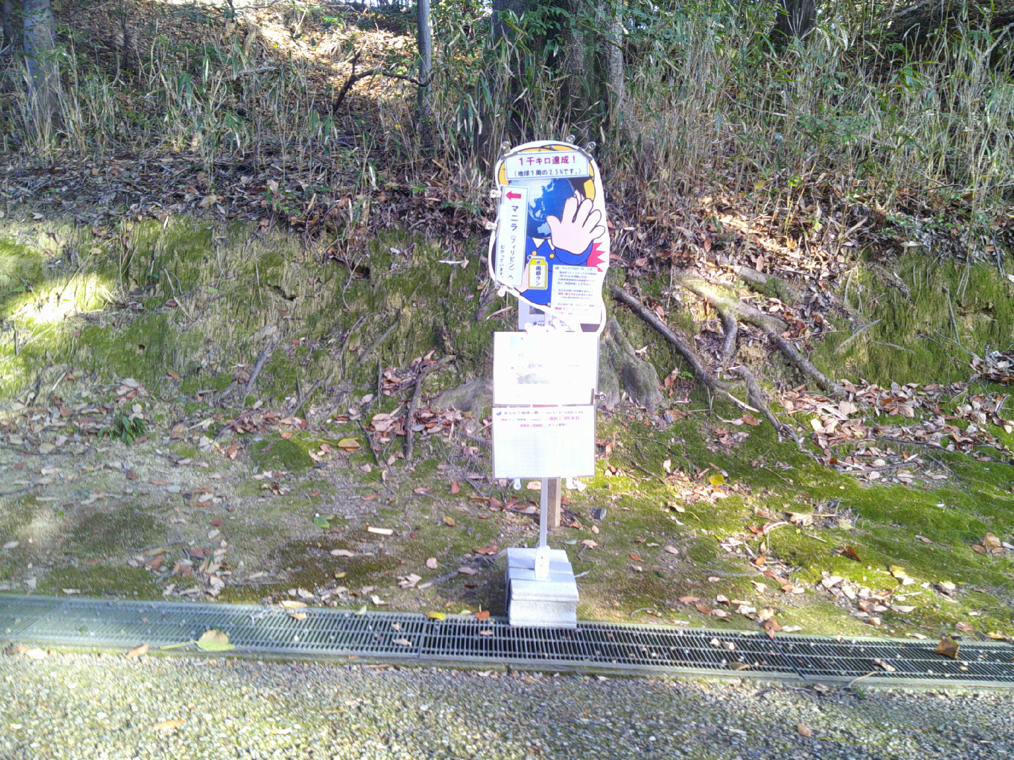 みんなの1周(1km)で、園路にいる「周回クン」が、2.5cm進み、4万周で、園路を一周します。