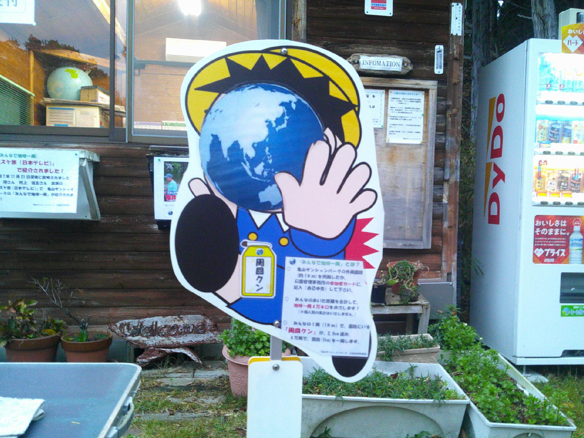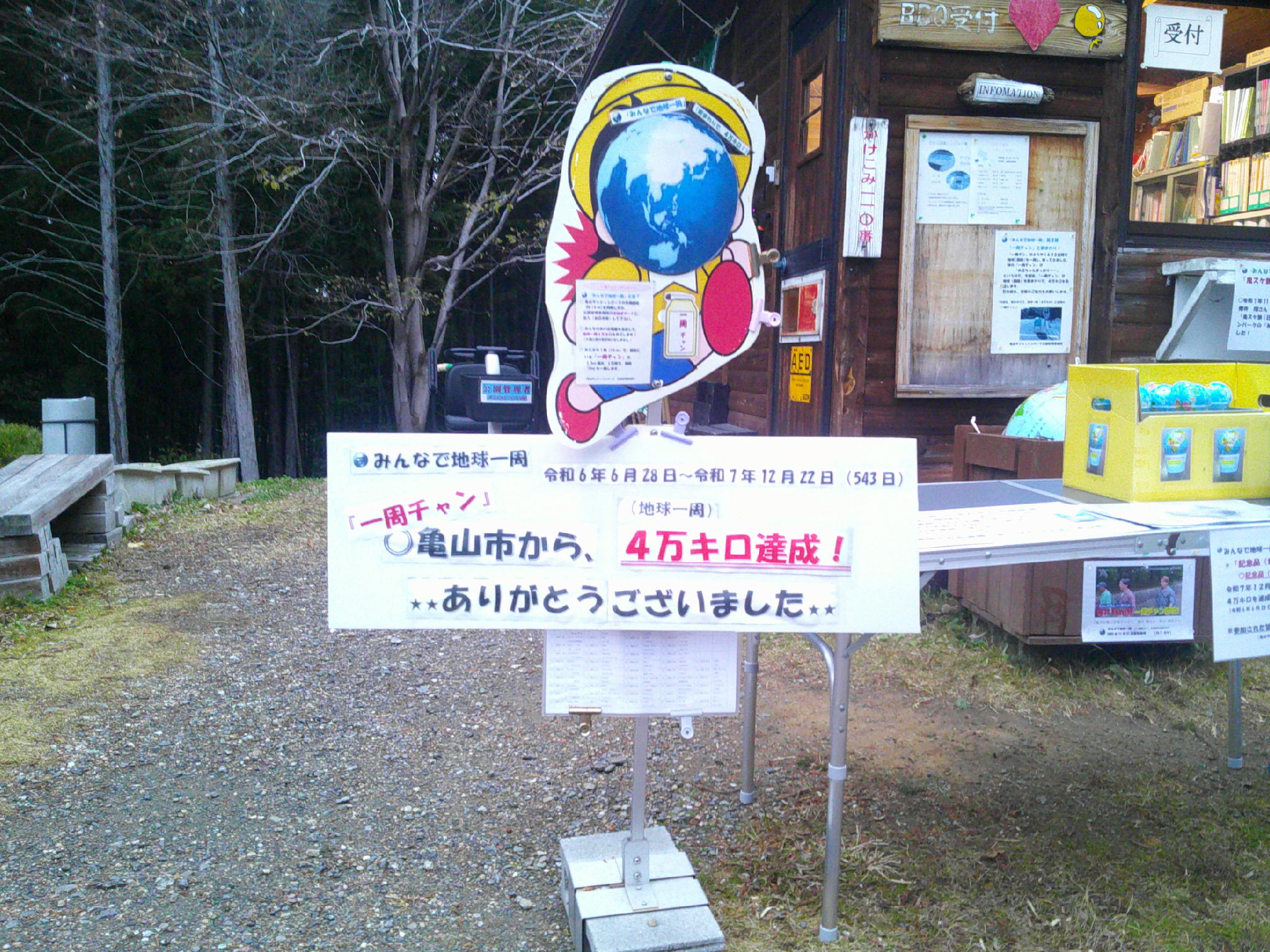 ◎「みんなで地球一周」は、第1弾「一周クン」と地球を西まわり:令和5年5月3日~令和6年6月27日(422日間)、第2弾「一周チャン」と地球を東まわり:令和6年6月28日~令和7年12月22日(543日間)で、「一周クン」と「一周チャン」兄妹の冒険の旅は終了しました。 ◎(今後について) 多くの参加者の方から継続のご要望をいただき、また、日本テレビで放送後、遠方からもお越しいただいておりますことから、第3弾「みんなで地球一周」(「周回クン」と南極経由)を実施することといたしました。引き続きのご参加、よろしくお願いします。 [caption id="attachment_6223" align="alignnone" width="300"] 「周回クン」[/caption] ◎「周回クン」物語 第3弾は…… 「一周クン」は、クラブ活動に忙しく、また「一周チャン」は少し休みたいと言っており、さて、どうしたものかと思案しておりましたが、親戚の「周回クン」が「ぼく行ってもいいよ」と言ってくれましたので、「周回クン」と南極経由で、地球一周4万キロを目指します。 日本から南へ南へ、フィリピン、インドネシア、オーストラリア、南極、ケープタウン、アフリカ横断、イタリア、中国、日本 また、冒険と出会いの旅が始まります… ご参加、よろしくお願いいたします。 ◎「みんなで地球一周」とは? ○亀山サンシャンパークの外周園路(約1km)を何周したか、公園管理事務所の参加者カードで、提出(自己申告)して下さい。 ○みんなの歩いた距離を合計して、地球一周4万キロをめざします!(※個人別の集計はいたしません。) ○みんなの1周(1km)で、園路にいる「周回クン」が、2.5cm進み、4万周で、園路を一周します。 どうぞ、お気軽に、管理事務所で参加カードに、ご記入ください。 皆さまのご参加お待ちしております。(毎日やってます!) (園路を4万周で、地球一周4万キロです) 地球儀の「周回クン」 1日平均70キロペースで南へ向かっています。 スタート地点(管理事務所)の「周回クン」※毎日少しづつ進んでいます!(参加者カード1キロにつき、2.5cm)