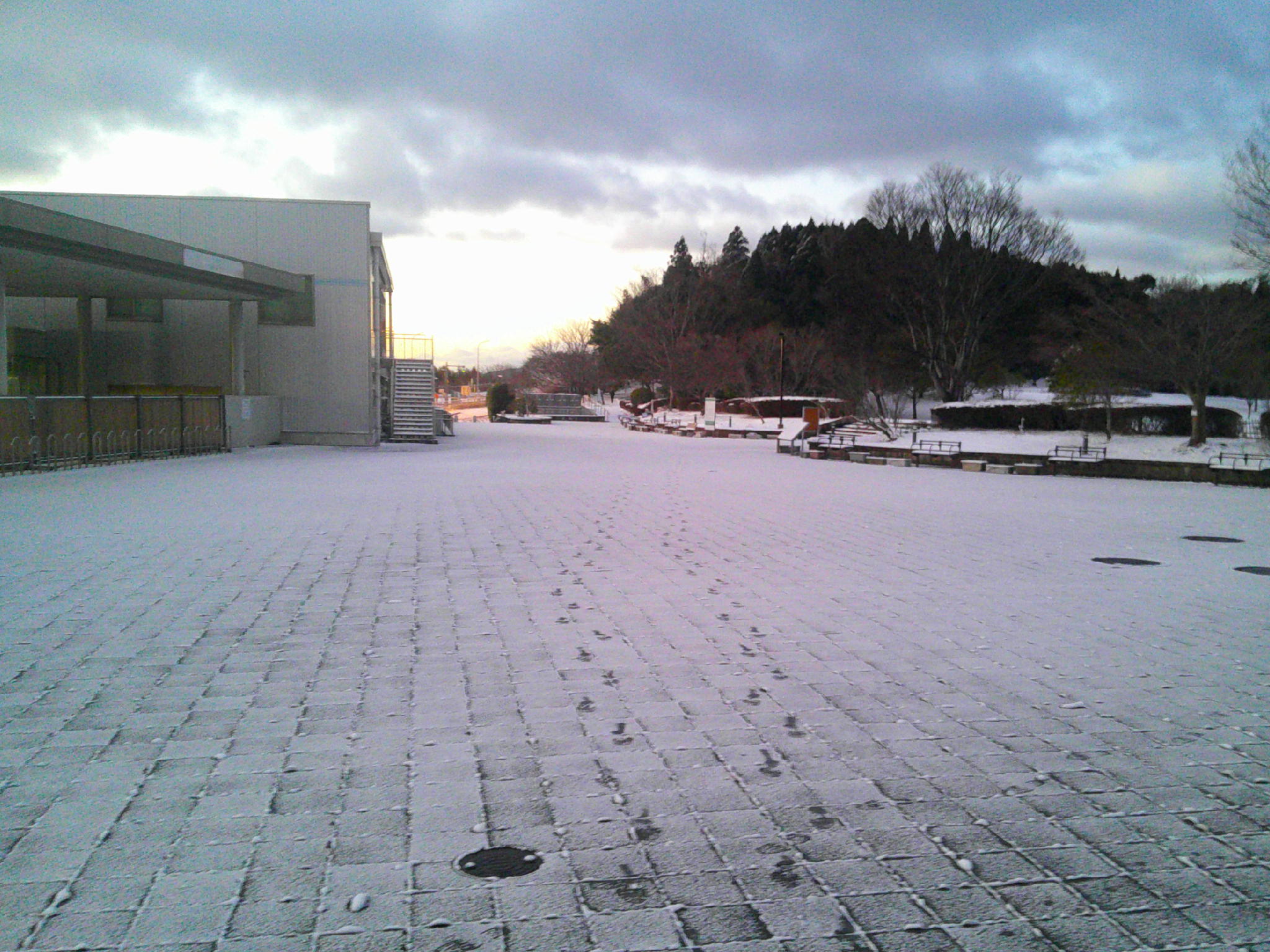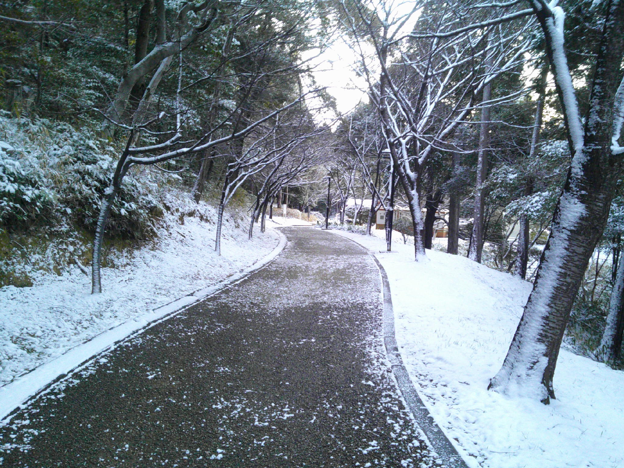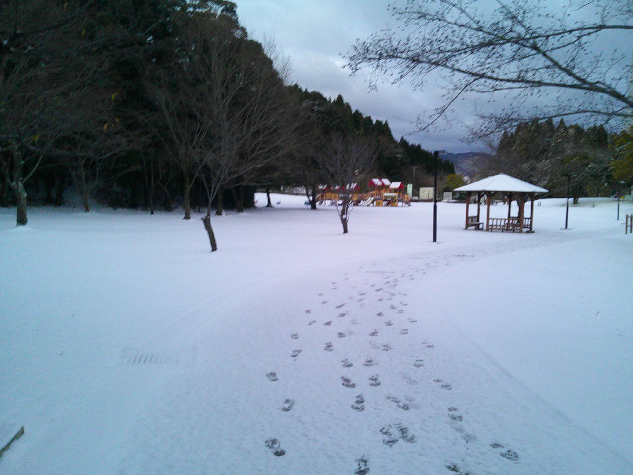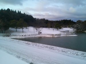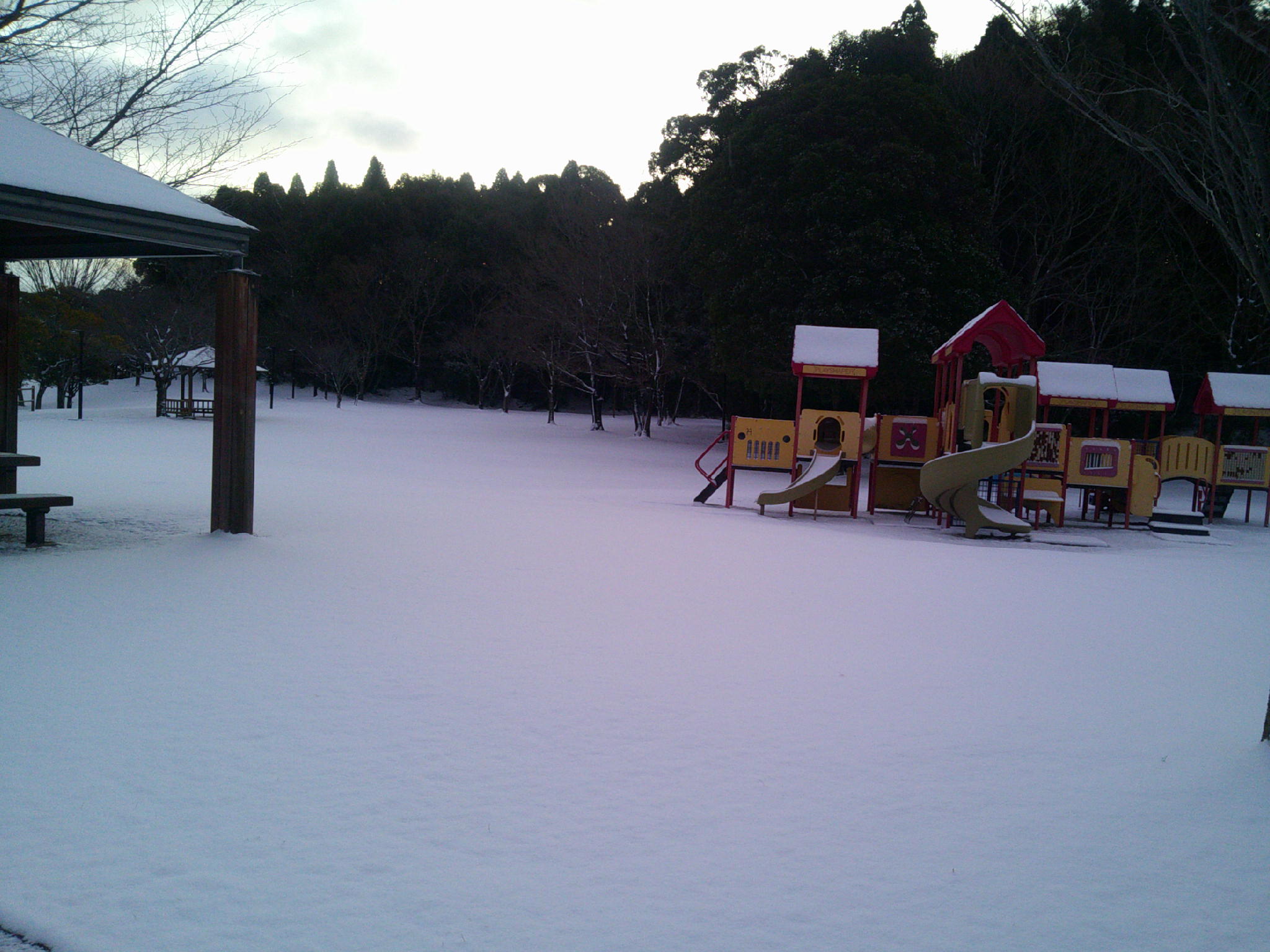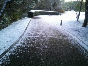 令和8年1月22日の積雪状況ですが、昨晩からの雪で、朝7時で、園内約2cmの雪がつもっています。園路は概ねとけて、歩行可ですが、芝生広場等は、一面銀世界です。周辺道路には雪もありますので、気をつけてお越しください。