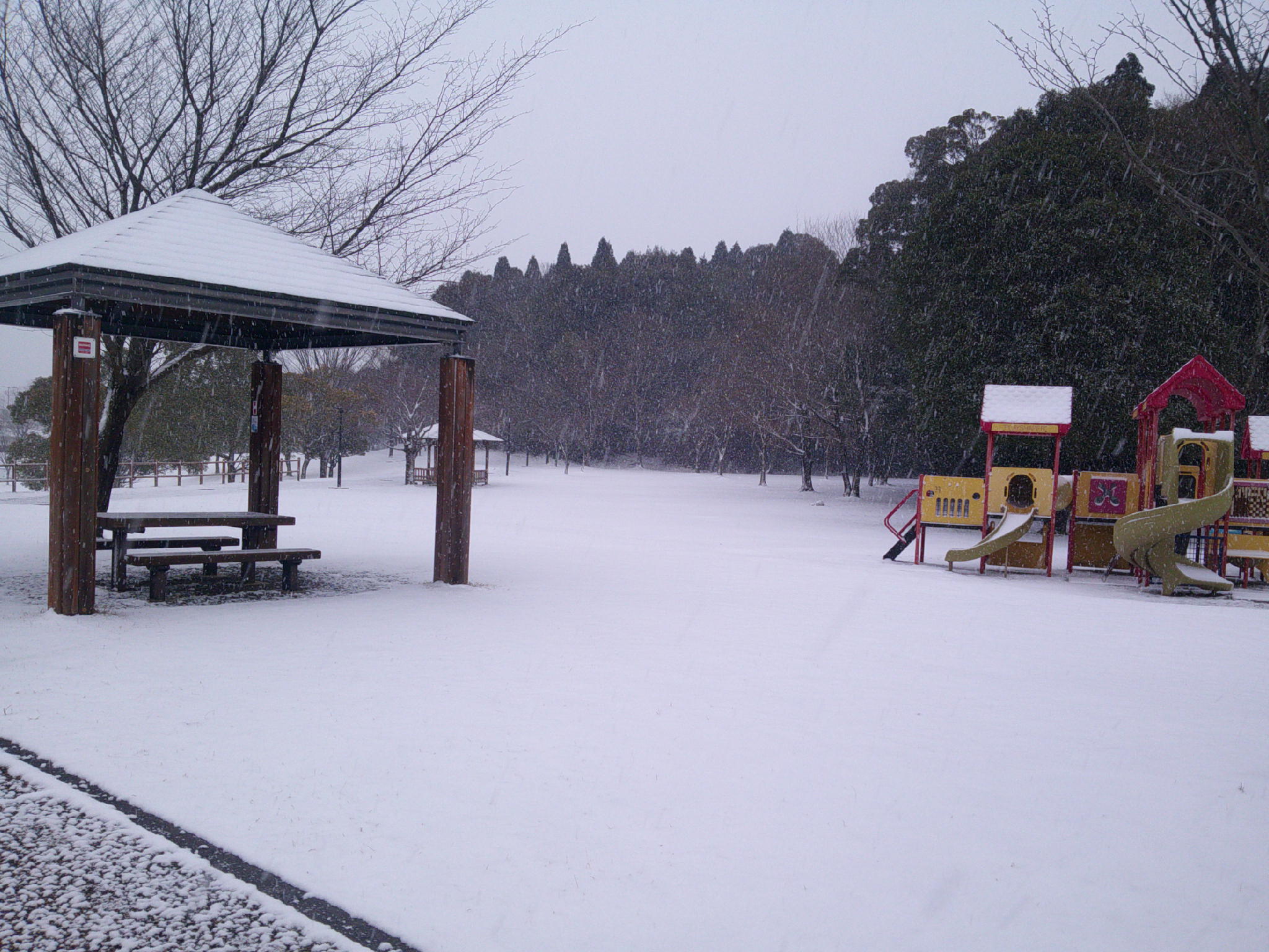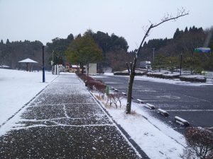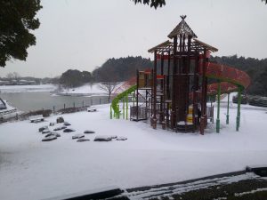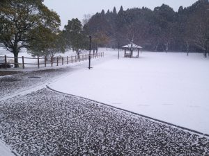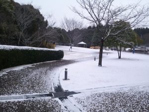 令和8年1月30日の積雪状況ですが、朝8時で、園内約2cmの雪がつもっています。園路は歩行可ですが、芝生広場等は、銀世界です。雪も断続的に降っていて、周辺道路は凍っている個所もありますのでご注意ください。