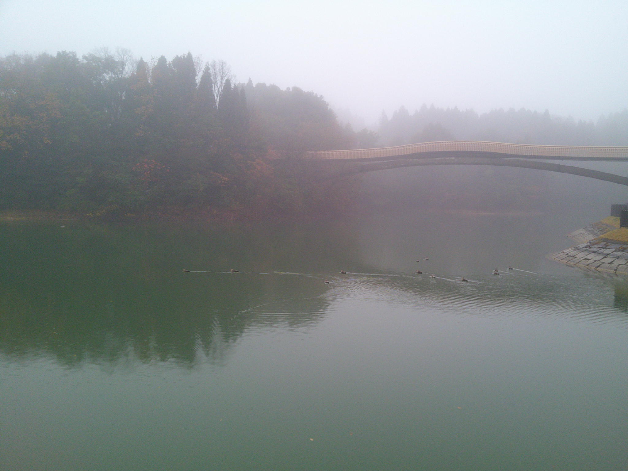 本日(12月21日)、三重県に濃霧注意報が発令され、亀山市内も朝から濃い霧につつまれています。亀山サンシャインパークも、濃い霧で、高塚池の対岸が見えにくいような状況です。おや、水面を何かが動いているようで…… カモの群れが悠々と…… 今年はカモが多く来ています。
