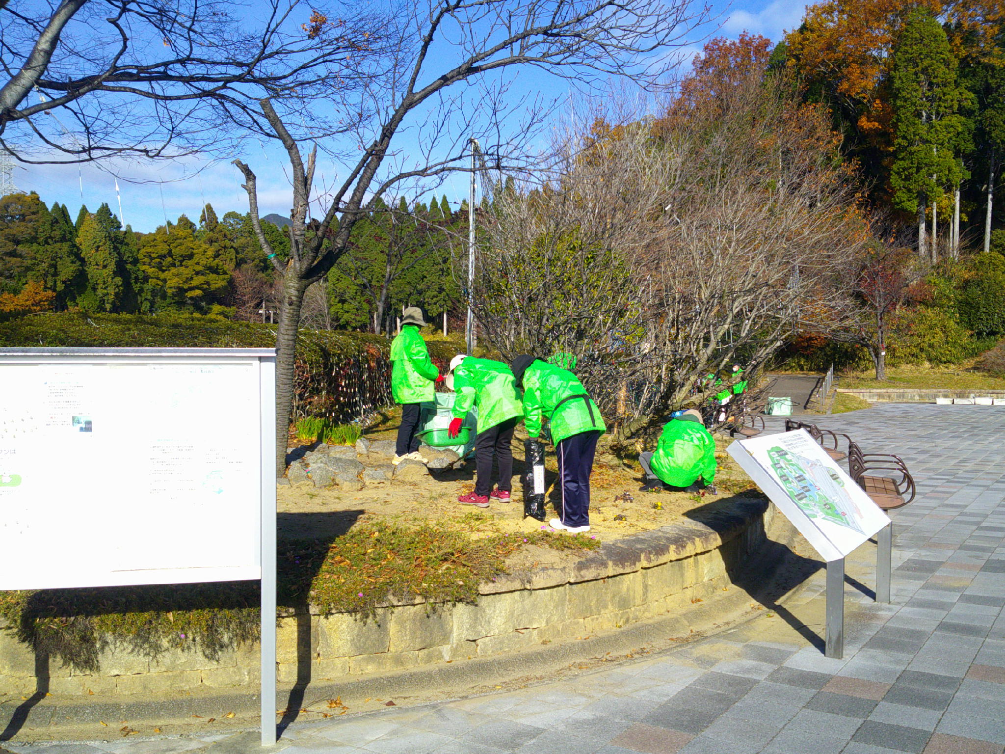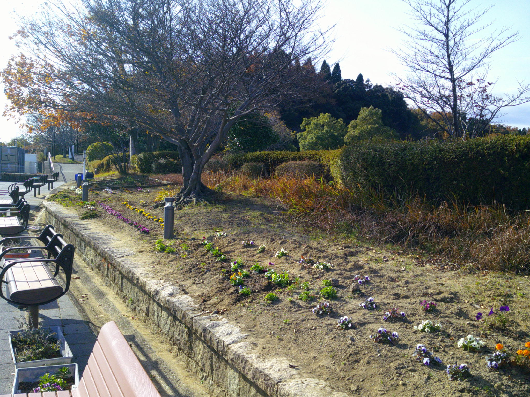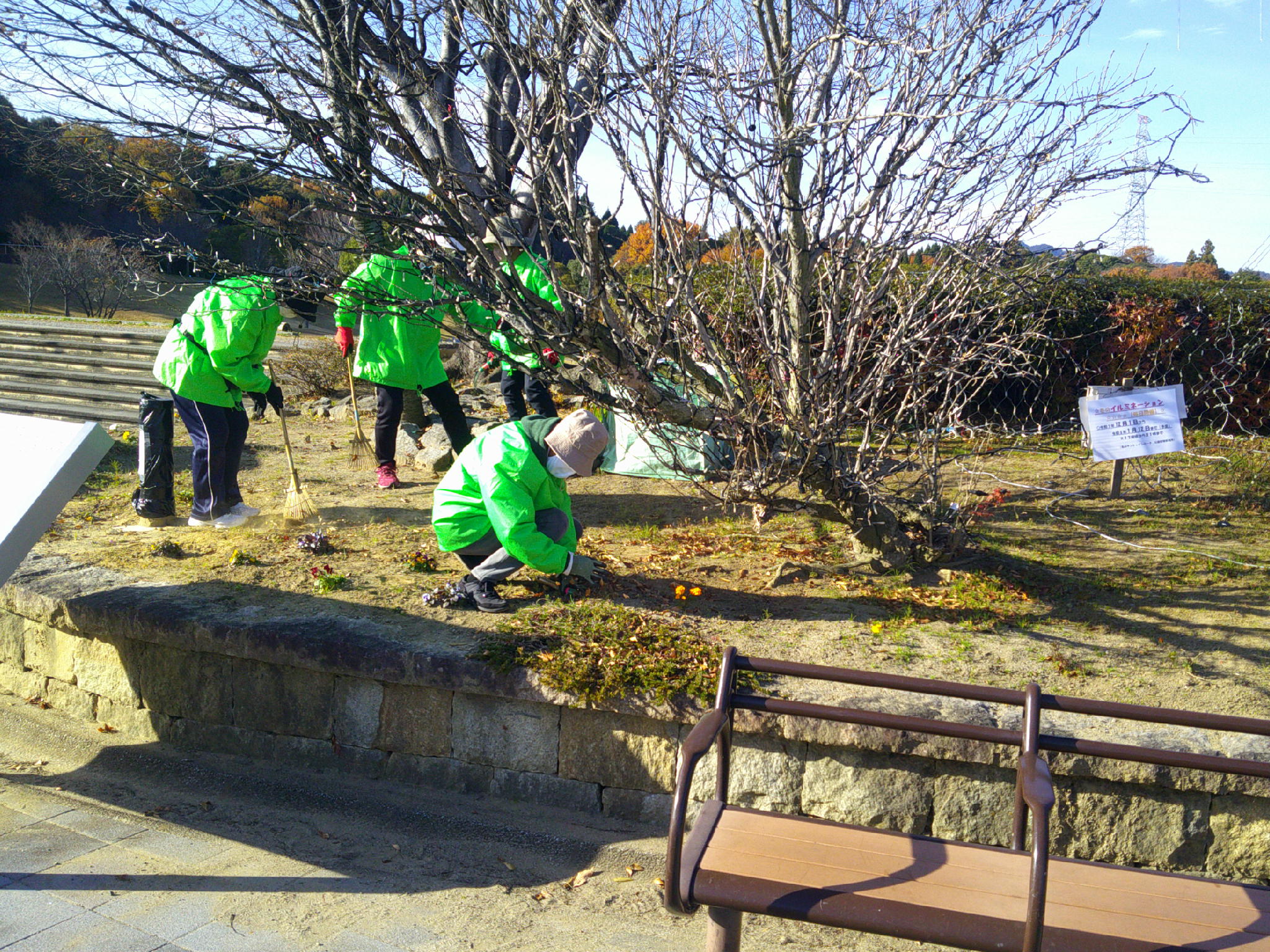 令和7年度12月の愛護会による活動を12月10日 (水) に行っていただきました。師走の冬晴れのなか、雑草を抜き、パンジー(12)、ビオラ(12)を植えていただき、また、イルミネーションが始まっているエントランス広場全体の落葉清掃もしていただきました。広場全体がとてもきれいになりました。ありがとうございました。よいお年をお迎えください。