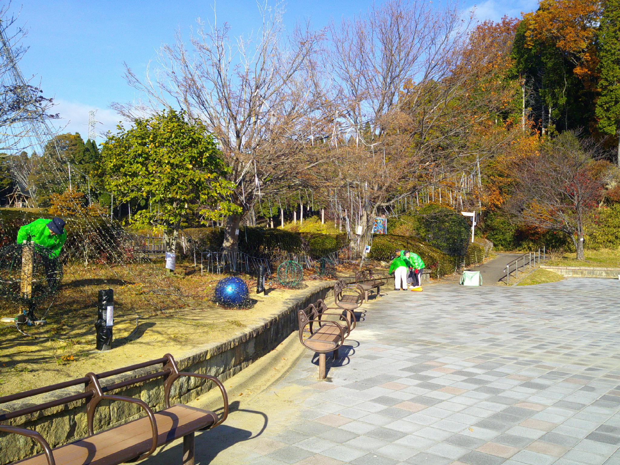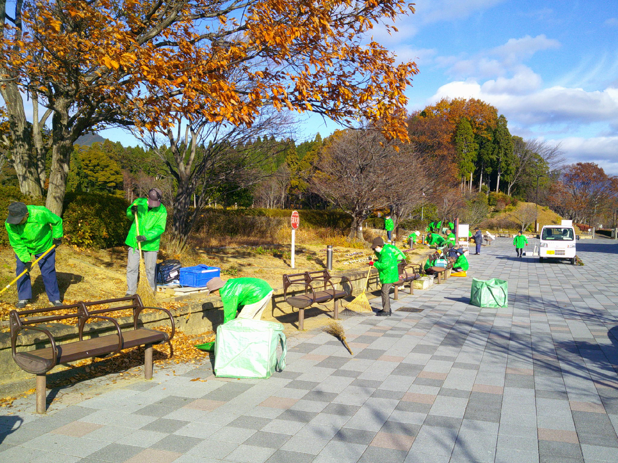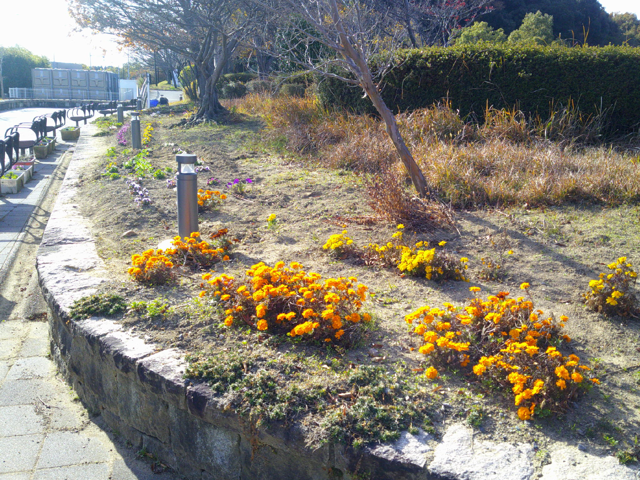 令和7年度12月の愛護会による活動を12月10日 (水) に行っていただきました。師走の冬晴れのなか、雑草を抜き、パンジー(12)、ビオラ(12)を植えていただき、また、イルミネーションが始まっているエントランス広場全体の落葉清掃もしていただきました。広場全体がとてもきれいになりました。ありがとうございました。よいお年をお迎えください。