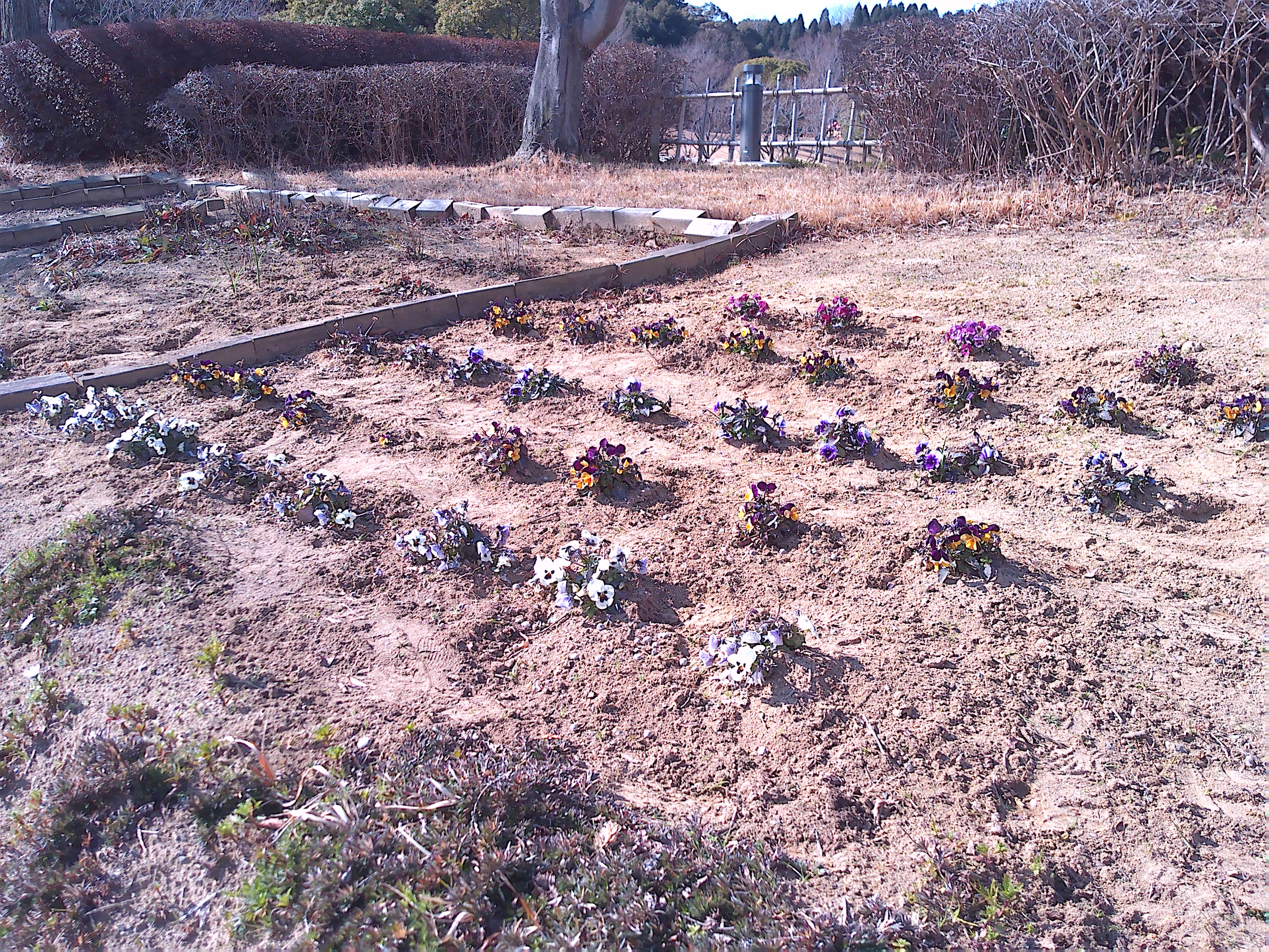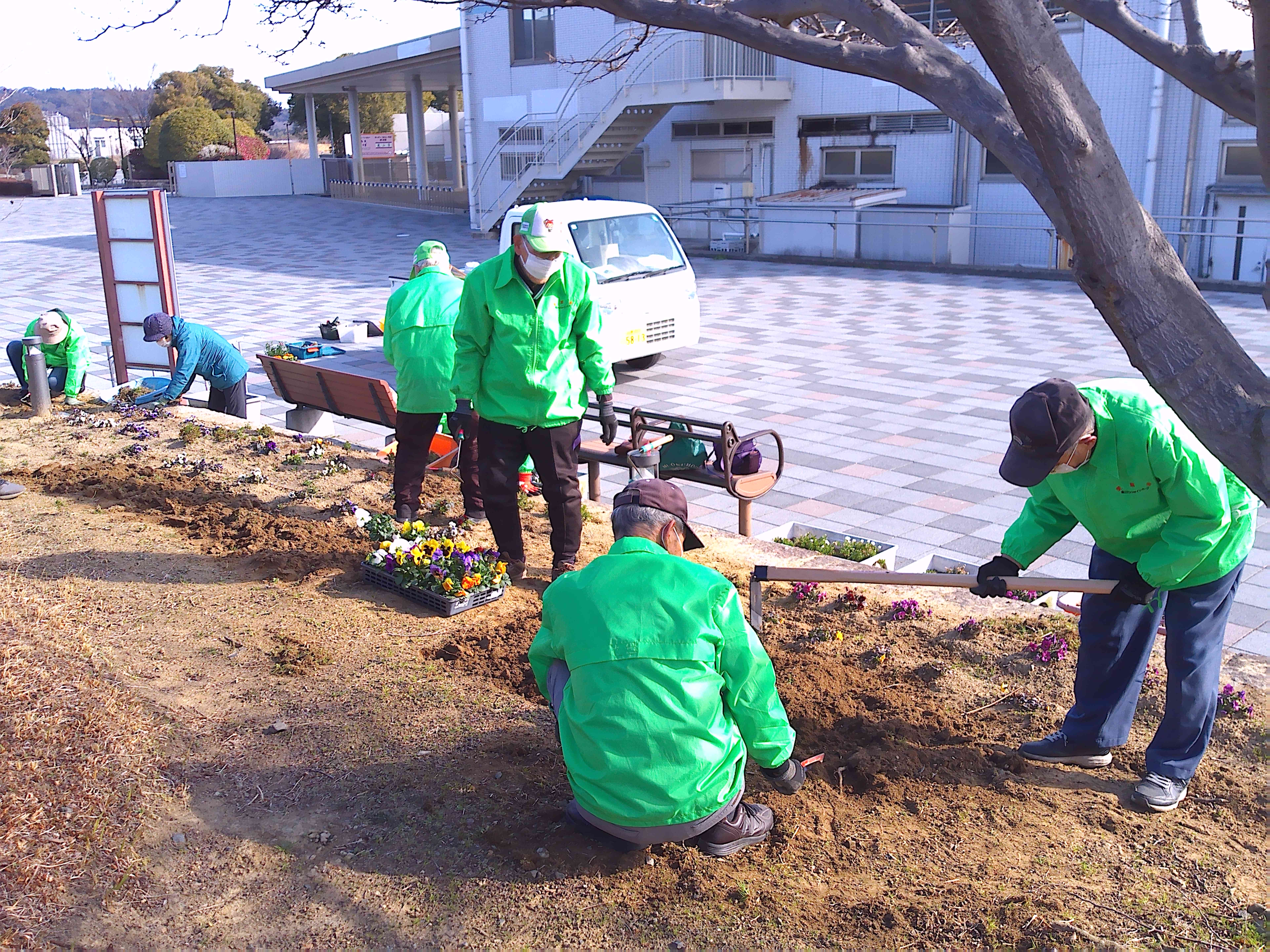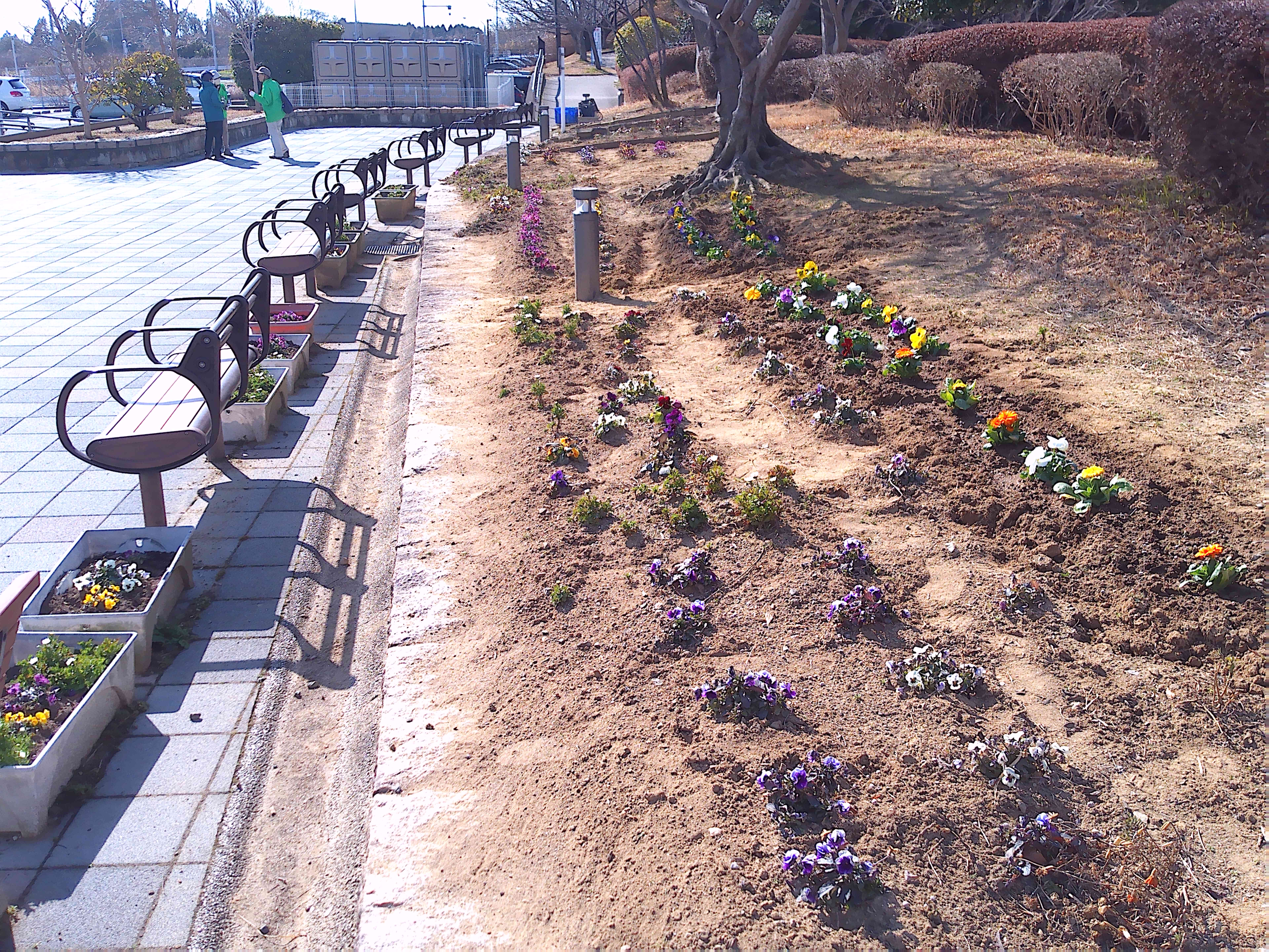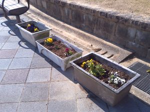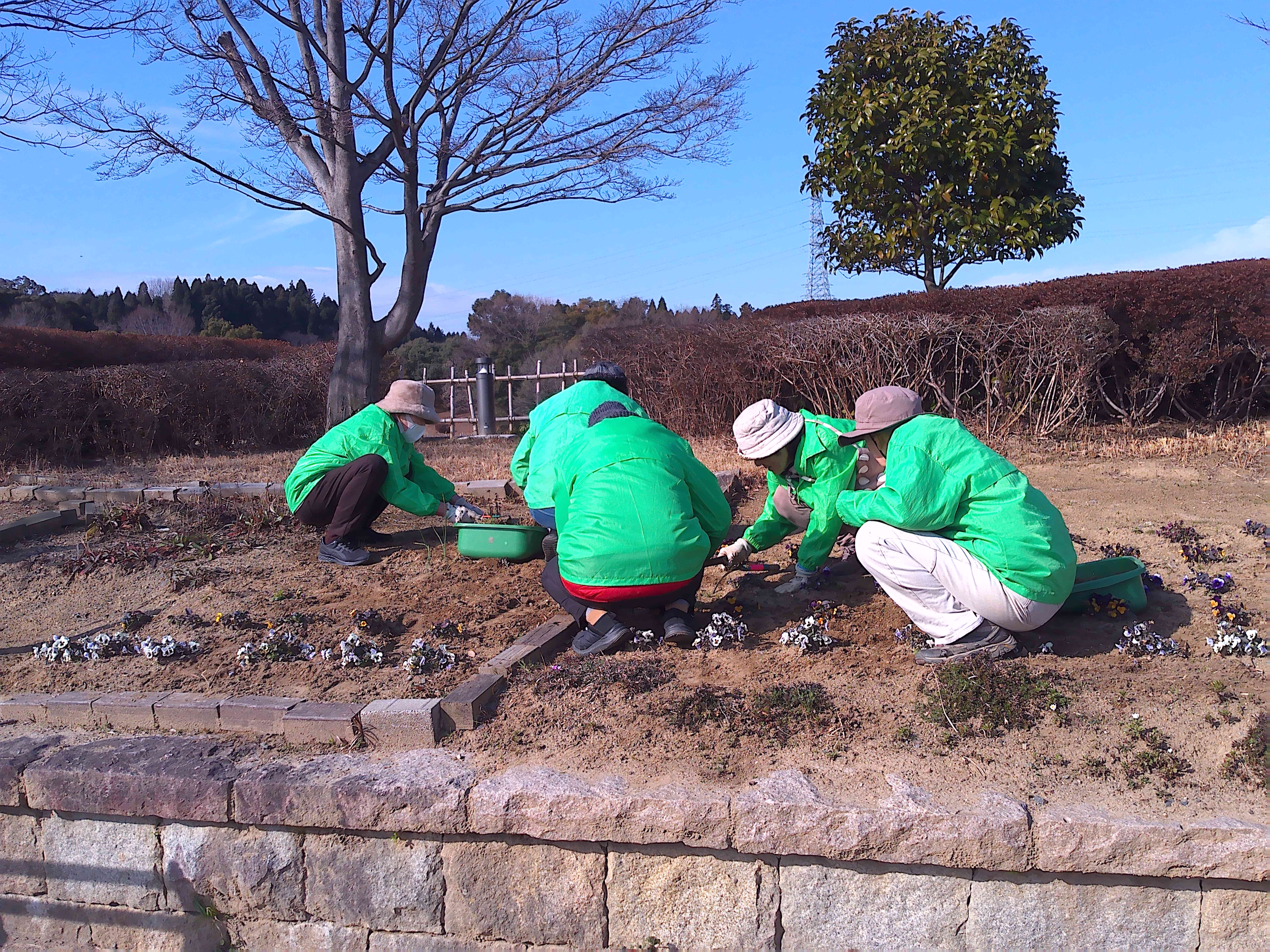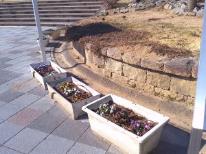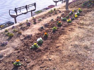 悪天候のため1週間のびました2月の愛護会による活動を、2月18日 (水) に行っていただきました。少し肌寒い晴天のなか、雑草を抜き、パンジー(28)、ナデシコ(5)、キンセンカ(5)を植え、花壇が花で明るくなりました。ありがとうございました。