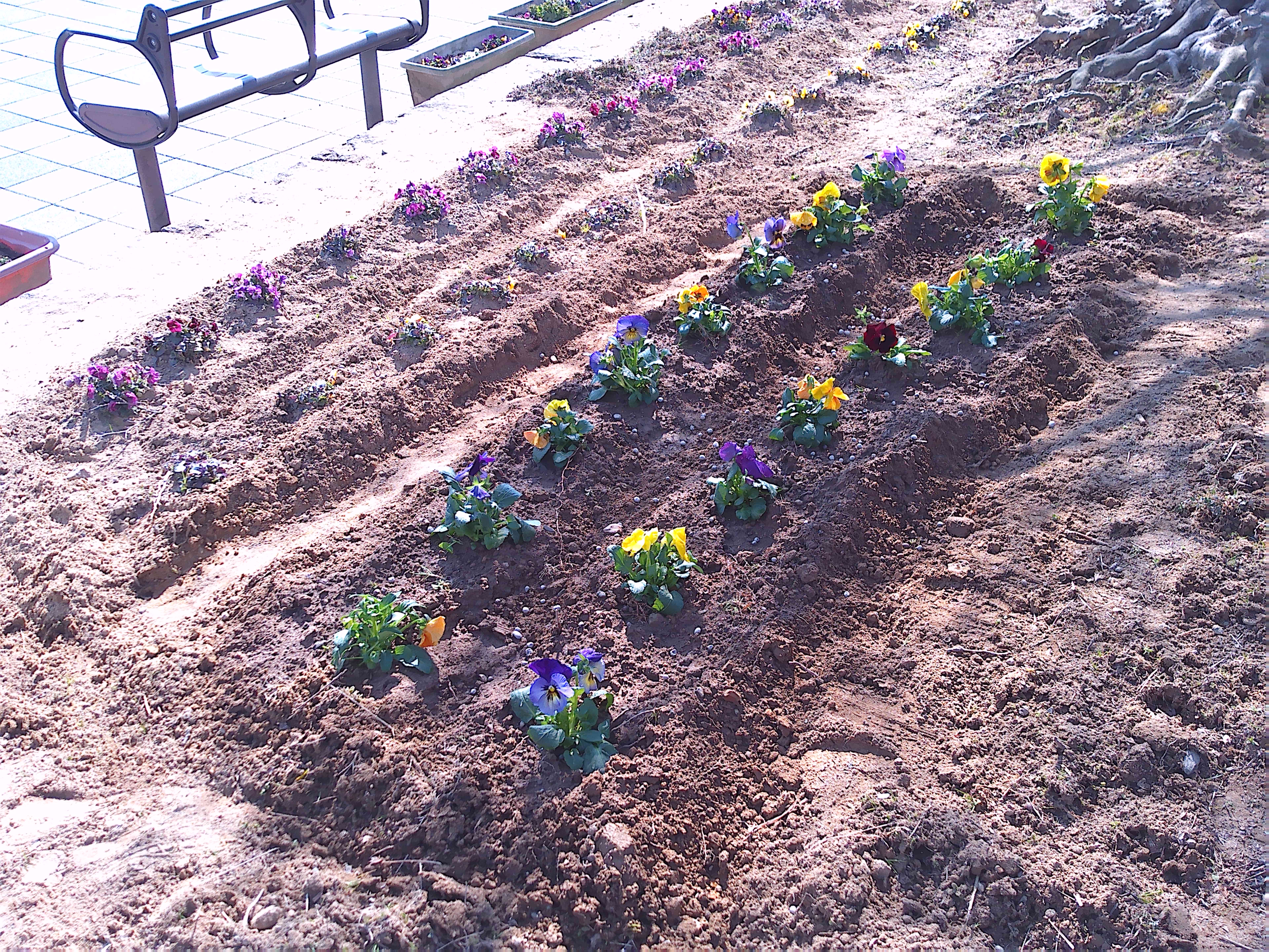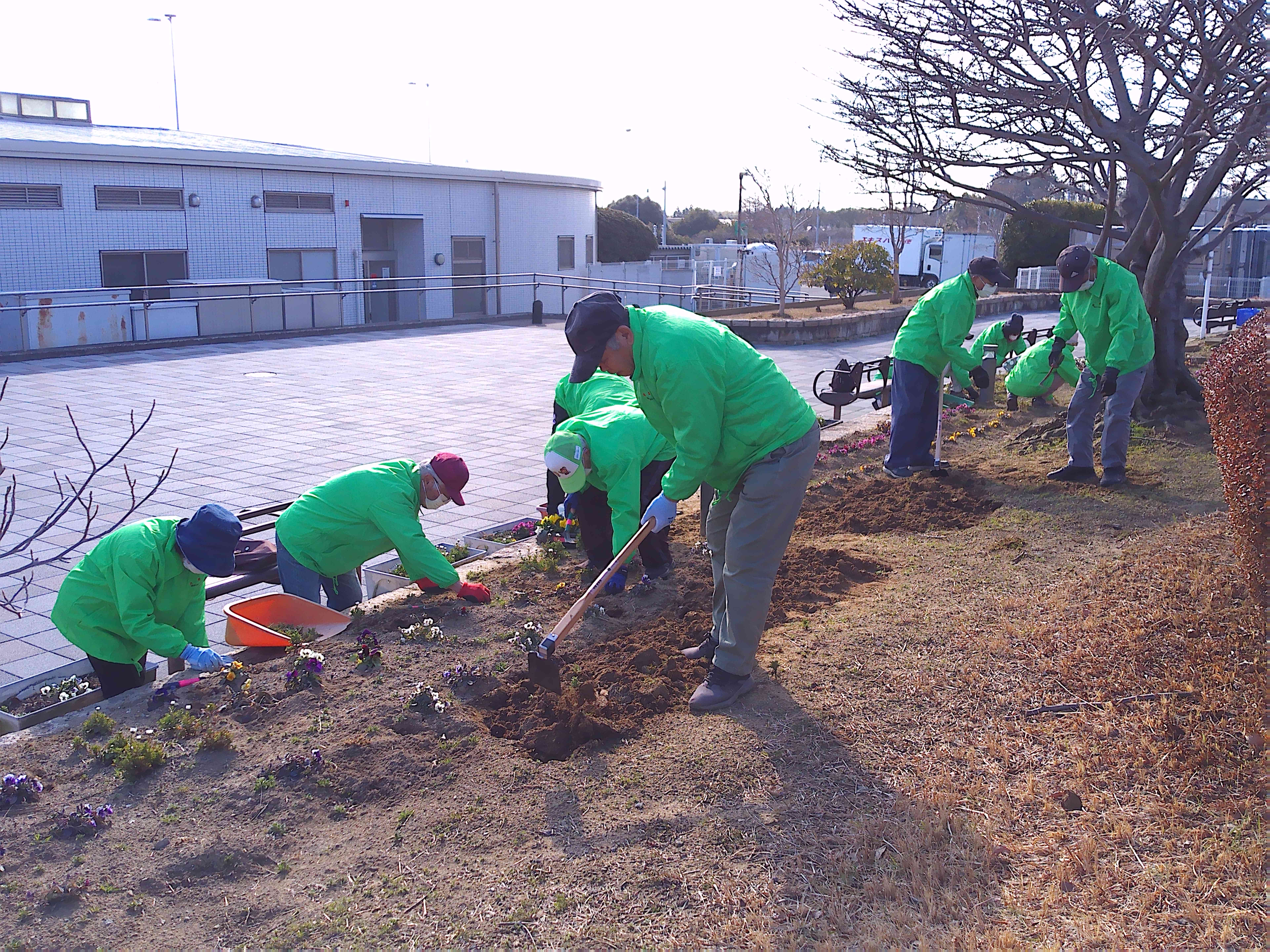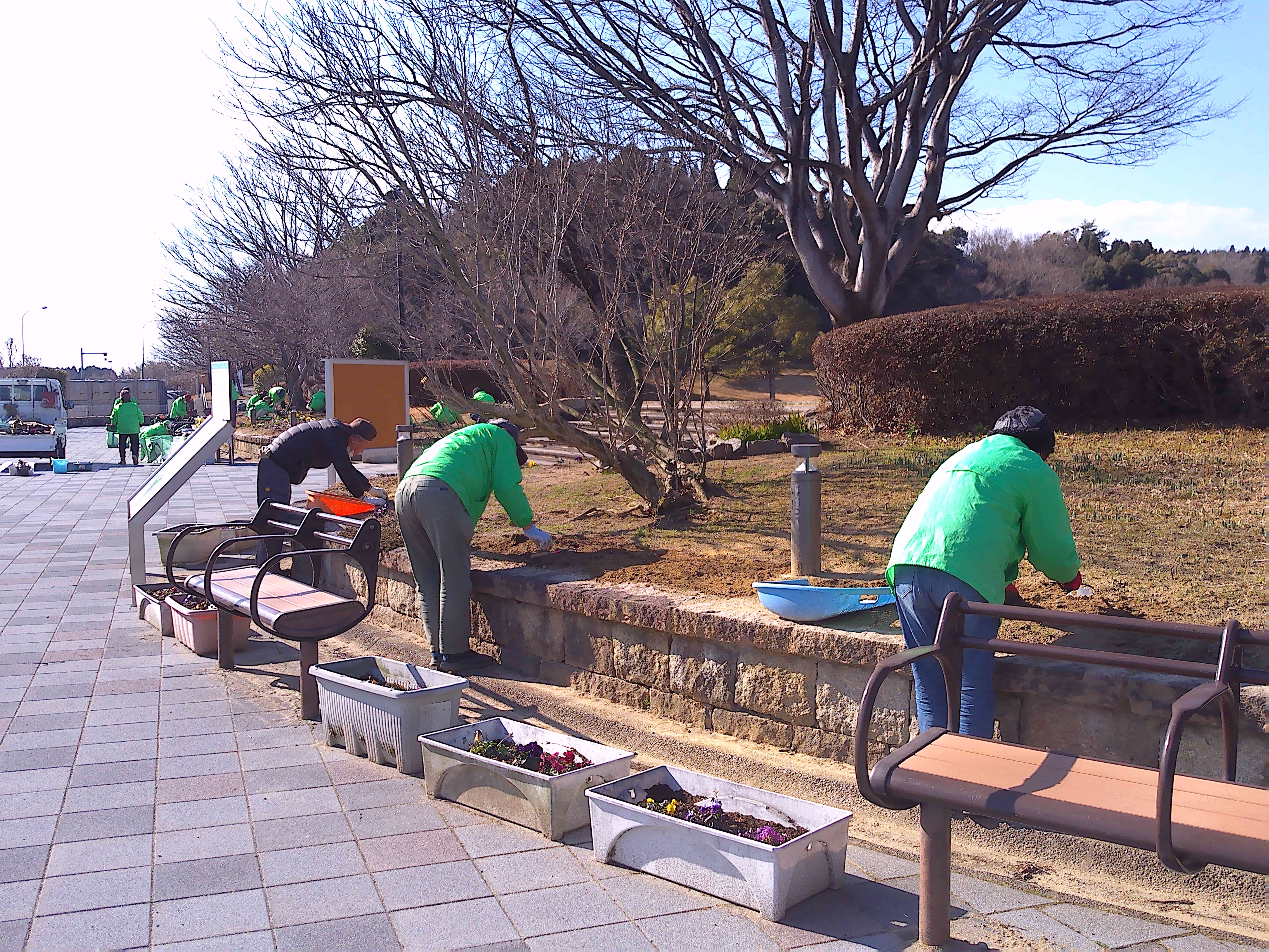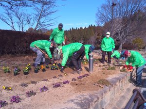 悪天候のため1週間のびました2月の愛護会による活動を、2月18日 (水) に行っていただきました。少し肌寒い晴天のなか、雑草を抜き、パンジー(28)、ナデシコ(5)、キンセンカ(5)を植え、花壇が花で明るくなりました。ありがとうございました。
