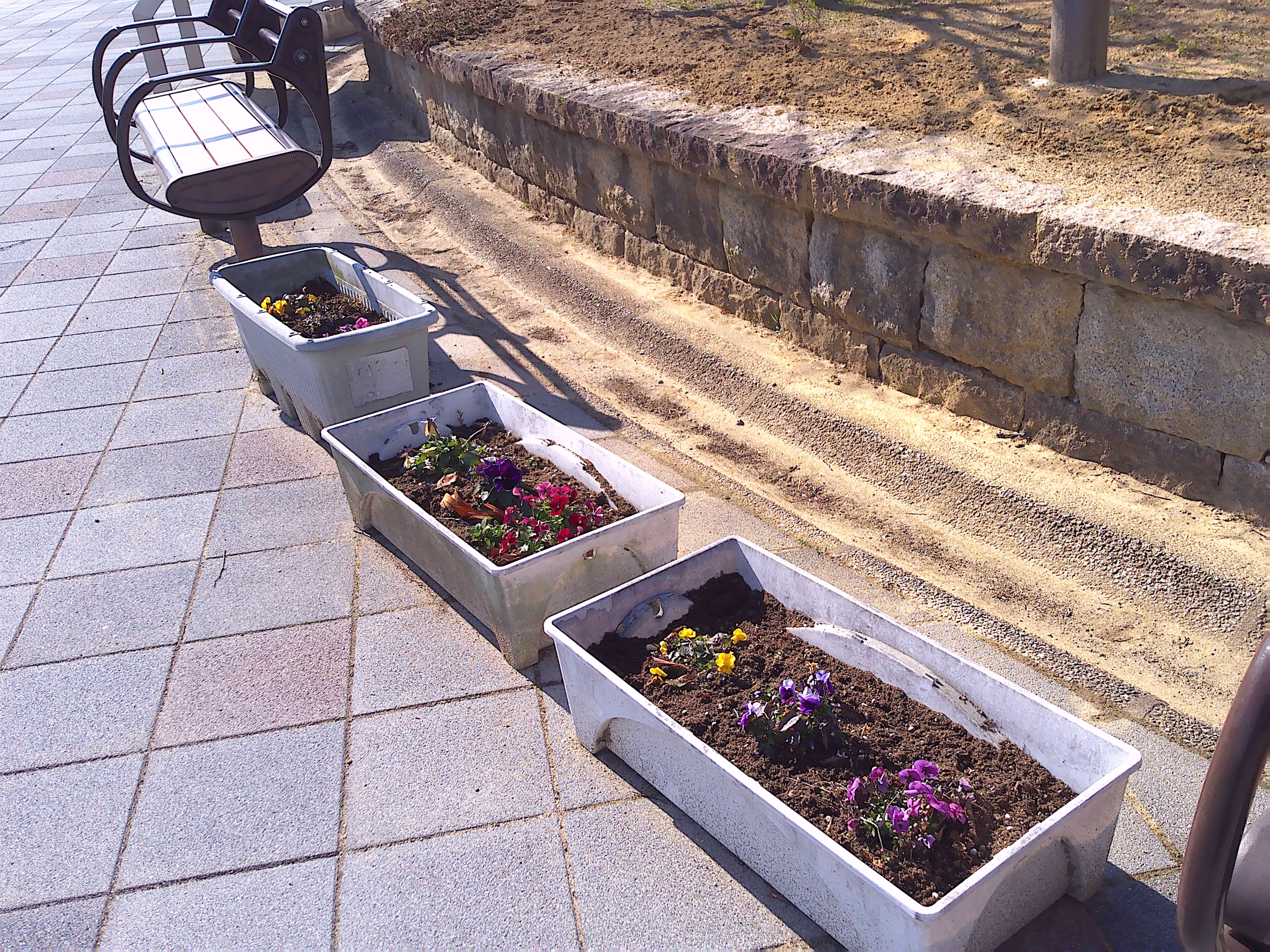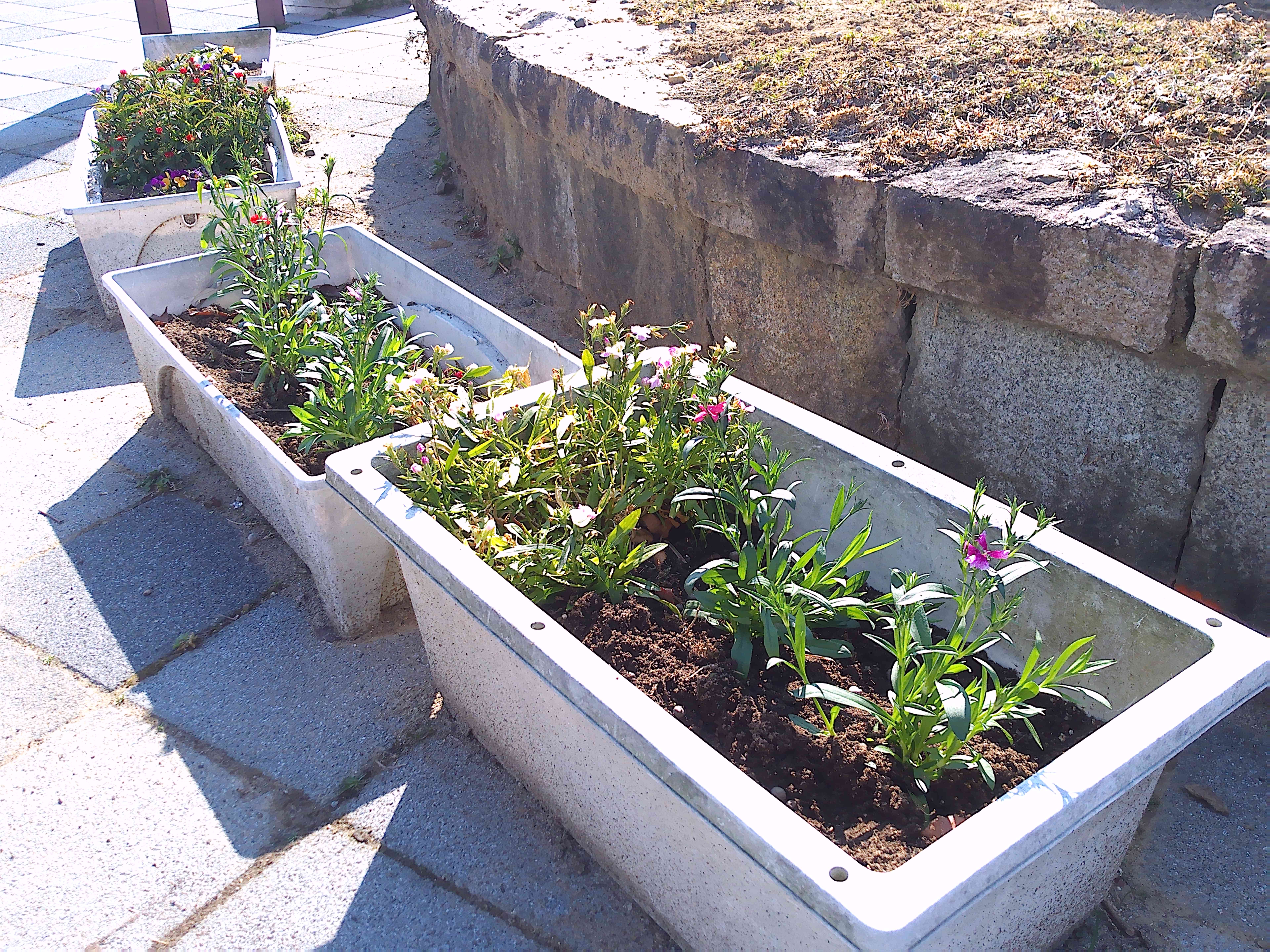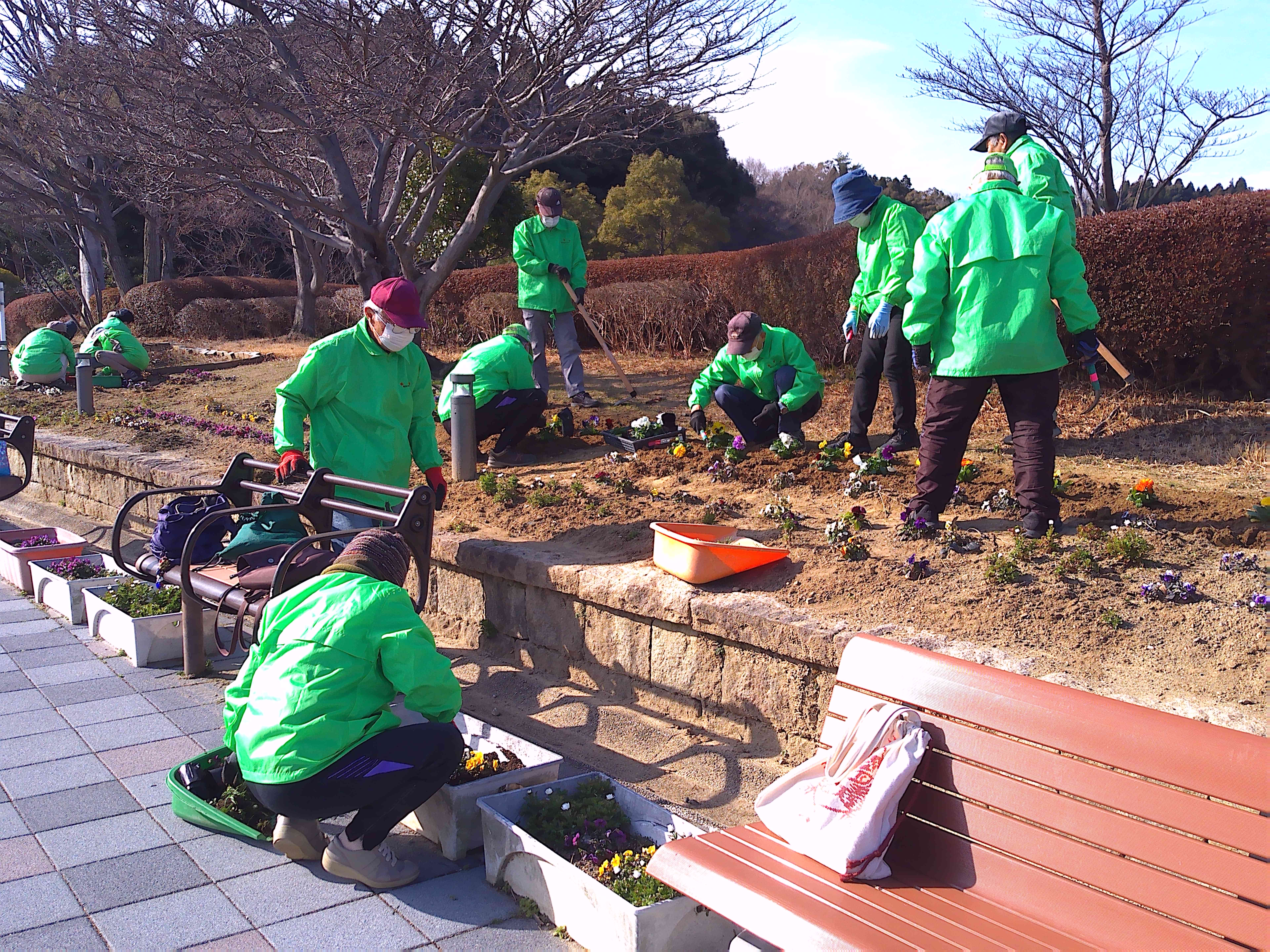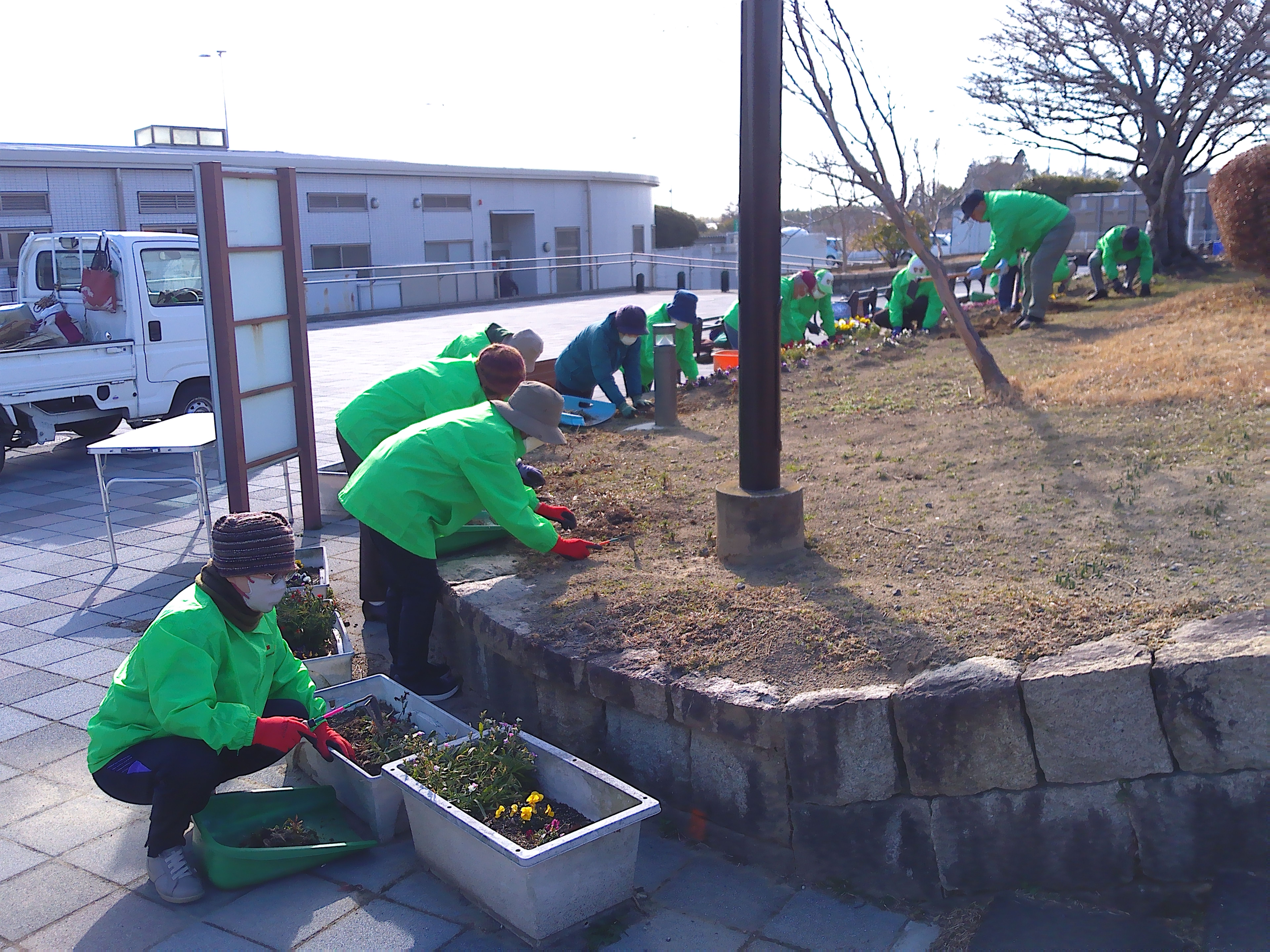 悪天候のため1週間のびました2月の愛護会による活動を、2月18日 (水) に行っていただきました。少し肌寒い晴天のなか、雑草を抜き、パンジー(28)、ナデシコ(5)、キンセンカ(5)を植え、花壇が花で明るくなりました。ありがとうございました。