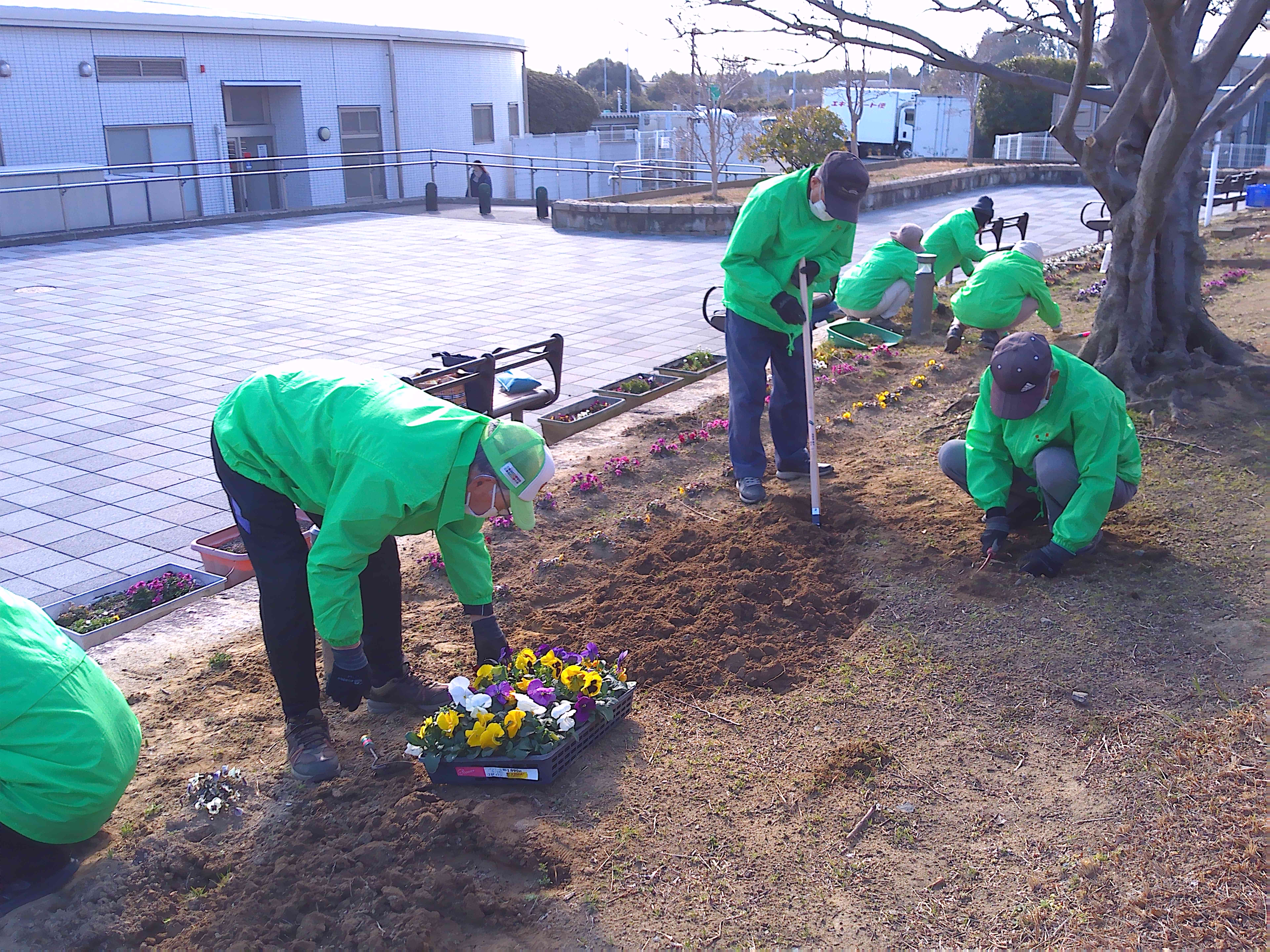 悪天候のため1週間のびました2月の愛護会による活動を、2月18日 (水) に行っていただきました。少し肌寒い晴天のなか、雑草を抜き、パンジー(28)、ナデシコ(5)、キンセンカ(5)を植え、花壇が花で明るくなりました。ありがとうございました。